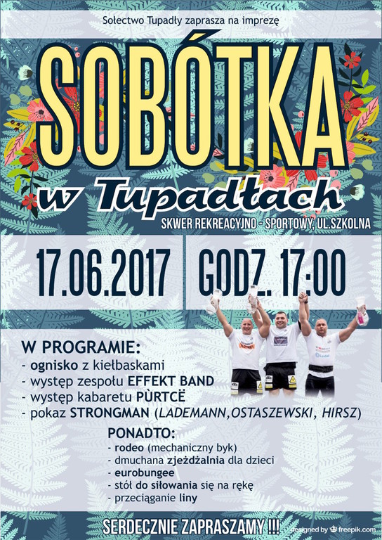 Sobótka w TupadłachSołectwo Tupadły zaprasza 17 czerwca od godziny 17.00 na imprezę – Sobótka w Tupadłach. Sobótka w Tupadłach odbędzie się na skwerze rekreacyjno-sportowym przy ul. Szkolnej w Tupadłach.